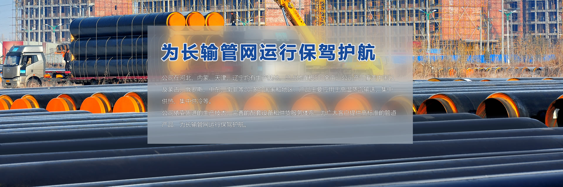 公司在河北、內(nèi)蒙、天津、遼寧均有生產(chǎn)基地,總占地面積500余畝。公司產(chǎn)品覆蓋中國以及蒙古、俄羅斯、中東、南非等20 多個(gè)國家和地區(qū),產(chǎn)品主要應(yīng)用于高溫蒸汽輸送、集中供熱、集中供冷等。 公司依靠先進(jìn)的生產(chǎn)技術(shù)、完善的配套設(shè)備和供貨服務(wù)體系,為廣大客戶提供高標(biāo)準(zhǔn)的管道產(chǎn)品,為長輸管網(wǎng)運(yùn)行保駕護(hù)航。